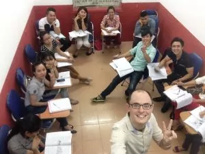 The teaching hours are from 8:00am to 10:30am and then around 5:30pm to 9:00pm, so there is usually a big break in the middle of the day. Everyone gets two consecutive days off per week. We work about 20 teaching hours per week. For most of our classes, we are substituting for a class that is normally taught by a Vietnamese teacher, so the students in the class will have the opportunity to practice and do some activities or games with the native speaker to get them feeling the native sound of the language. Each week our schedule is different, though there are listening and conversation classes that people sign up for that occur routinely. We have all different ages, from 4 to 5 year-olds to adults. We get a book, so we find supplemental activities relating to the topic we are supposed to cover for that class.